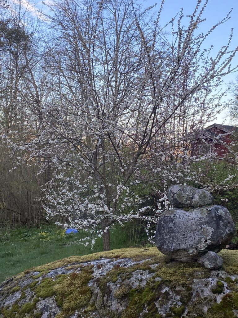 Talon nurkalla kaksi aikanaan lahjaksi saatua piskuista tainta ovat kasvaneet kunnon puiksi ja kukkivat joka vuosi, nyt ehkä liiankin aikaisin. Sakura on vain koriste, ja nyt jo sulkasatoinen, mutta luumupuu on hulvahtanut kukkaan ja on jo parina vuonna tuottanut maukkaan ja runsan sadon.