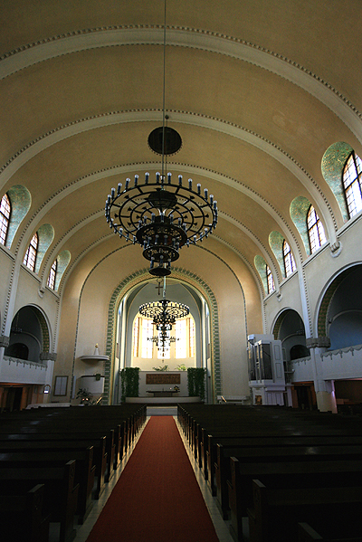 En lapsuuden jälkeen ole tainnut koskaan käydä tuossa kirkossa, kunnes juuri viime kesänä kävin A:n kanssa Kalliossa leipää Waystä ostamassa (se hapanjuuri) ja silloin kävimme myös temppeliä katsastamassa, koska se oli auki yleisölle. Ja nyt olinkin siellä ihan puhumassa noin vain. Simsalabim. Edessäni koko kirkko penkkeineen, takanani alttari. Ja yllä kumeasti kaikuva holvi.