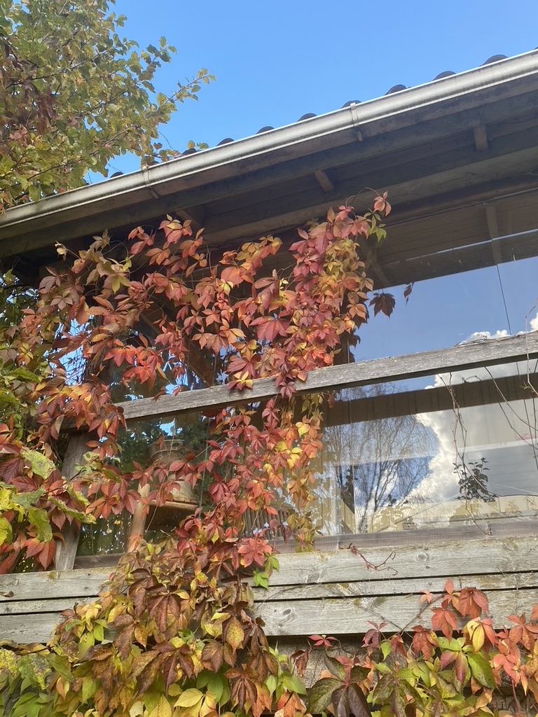 Täällä kotonamme villiviini kipuilee nimensä mukaisesti lasitetun kuistinkin seinustalle ja yrittää myös joka vuosi vallata koko talon.