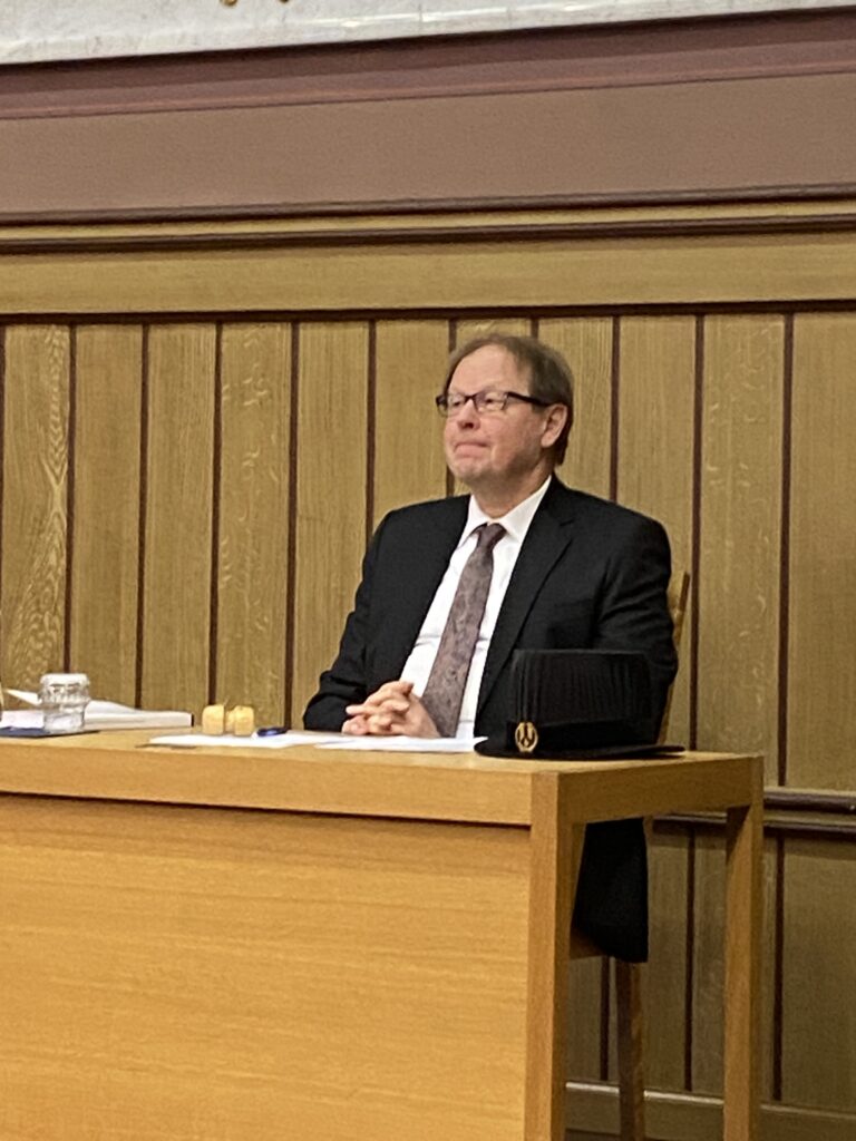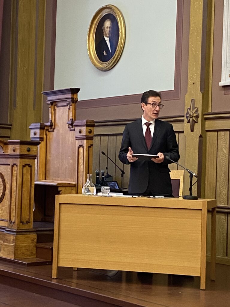 Väitöstilaisuuksia olen seurannut ennenkin. Tämä Jyväskylän vanhassa seminaarissa pidetty tilaisuus poikkesi suuresti kaikista edellisistä. Nyt vastaväittäjä, maailmalla tunnettu ja tunnustettu taloustieteilijä Michael Ehrmann lähinnä kyseli (englanniksi) äärettömän kiinnostuneena ja hyväksyvästi Heikkisen valtaisasta (englanniksi kirjoitetusta) väitöskirjasta, se kun oli parikin kertaa pitempi kuin normaalisti. Ensin kuva vastaväittäjästä.