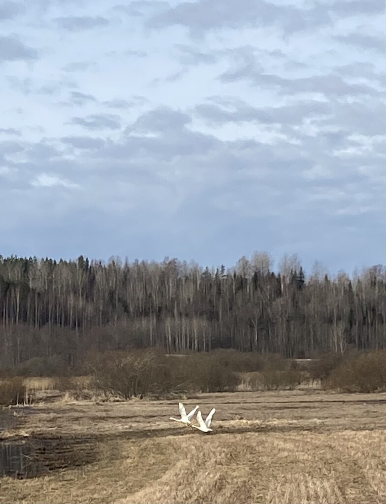 Kolmas kevään merkki ovat äänet, joita ei pitkään aikaan ole kuullut; niihin herää ja havahtuu yhdessä kevään kanssa. Eilen kuulin jo mustarastaan laulua, ei enää tuon mustiaisen arkaa harjoittelusopertelua. Toissapäivänä alapellon valtaojan jäällä istui kokovalkeisiin pukeutunut pariskunta, kaksi joutsenta, jotka olivat ehkä samoja, jotka aina täällä pesivät. Kailottaen ne siitä lähtivät kohti Musterpyyn järveä etsimään joesta järveen virtaavaa vettä, mutta pianpa tuo valtaojakin on auki, sitten koko oman laaksomme joki.