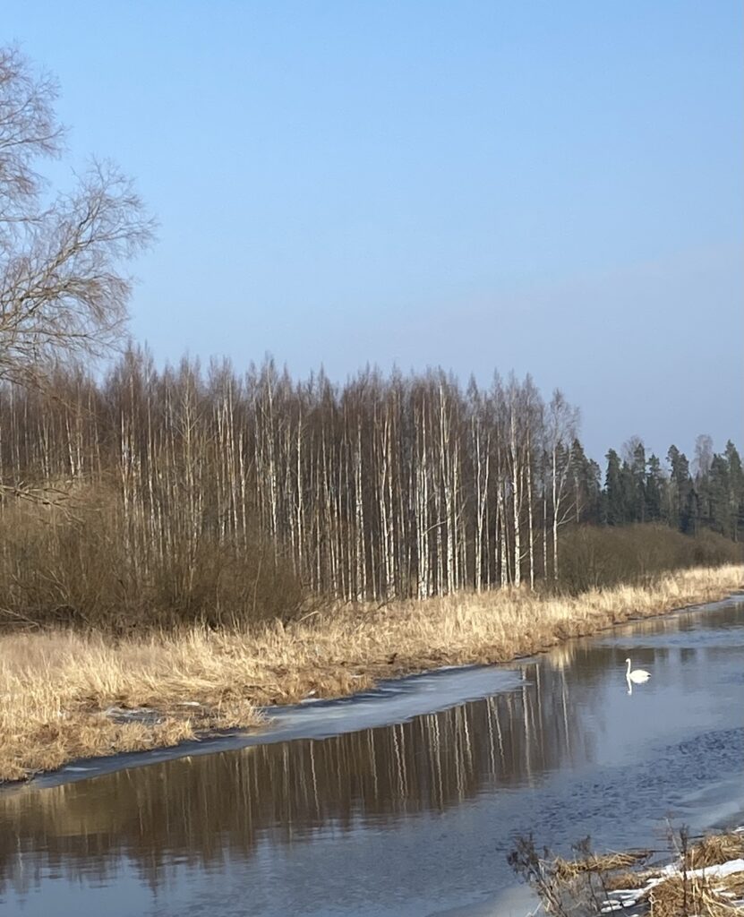 Joutsenet olivat ensimmäinen kevään varma merkki, ne tulivat ja jäivät, vaikka vielä äsken vapaata vettä oli aivan minimaalisesti. Mutta nyt niitä ui joella, joka virtaa vapaana ja meille jo tuttu pariskunta (näin uskon) pitää jöötä takasuolla, valtaojalla, jossa se aina pesii. Viime vuonna poikasia taisi olla neljä, kun taas kurkien joukkoon ei saatu yhtäkään. Hyvä, etteivät kurjet ole vielä tulleet, itse suo on yhä jäässä. Mutta voihan olla että jo iduksena kuulen kurkienkin huutoja. Kylläpä kaipaan niitä mestari Sibeliuksen tavoin. Kevättä, elämän uudistumista ne joikuvat.