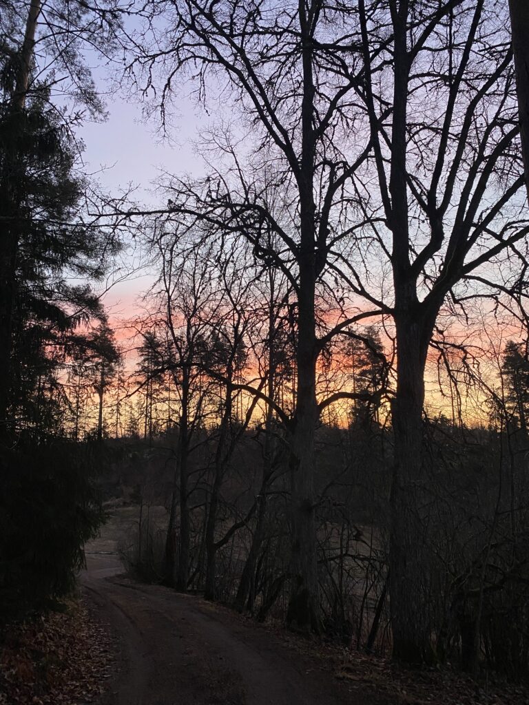 Nyt on aamu, sen tulevasta armosta en tiedä, mutta hiljaista ja kaunista on. Aurinko on nousemassa, kello jo puoli kahdeksan. Miten äkkiä valon määrä kasvaa. Nyt oli valoisaa jo kuudelta ja eilen näkyi hämäränvaloa vielä seitsemältä illalla. Tasaukseen ei ole matkaa enää kuin pari viikkoa, samoin kellojen kääntelyyn. Silloin katoaa aamusta tunti, jonka ilta heti kaappaa omakseen. Kesäaika alkaa.