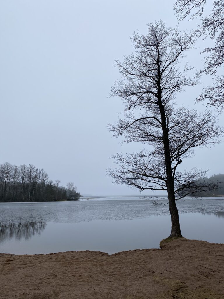 Päätöstä edisti se, että lämpöä oli vain pari astetta ja kaikkialla sadesumua joka peitti maisemaa ja sai sen pehmeäksi ja ystävälliseksi. Ottaisin järvestä muistoksi kuvia. Niitä kymmenien tuhansien vastaavien joukossakaan ei silti koskaan tunnu olevan liikaa.