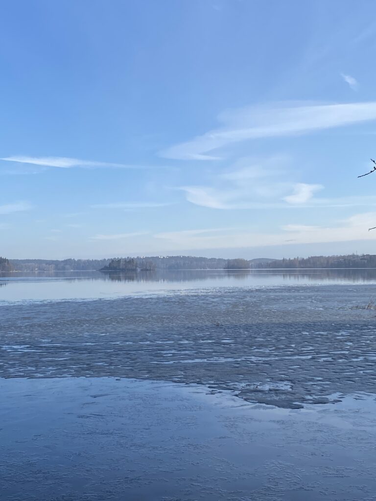 Jää on kovana kirkasta ja siinä on vivahdus taivaasta heijastuvaa sineäkin, mutta kun se alkaa antaa periksi, sinisen sävy muuttuu. Ensin se on lähes mustaa hetken, vivahtaa joskus vihreään, on sitten tummansinistä, harmaatakin. Mitä enemmän jää sulaa, sitä enemmän siinä näkee sävyjä. Kunnes vettä alkaa olla vapaana kaikkialla järvessä ja jäästä sulanutta hyhmää näkee enää vain vähän niin kuin liian kauan seisoneessa baaritiskin juomassa, joka siihen on bilettäjältä unohtunut. Ja sitten, niin, sitten järvi on lopulta kokonaan pakkasten kahleista vapaa.