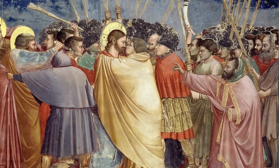Mukana oli Juudas, kavaltaja, rahojen kiilto silmissään (30 hopearahaa) ja hän vain kuunteli ja yritti olla siinä mielin kielin muiden kumppanien seurassa. Jopa suuteli Jeesusta ystävyytensä merkiksi. Juudaksen suudelma, niinpä. Sen ikuisti puolestaan Giotto.
